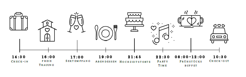 wie ihr auf dem Zeitplan seht, findet das Check-in für die Zimmer bereits ab 14.30 Uhr statt. Vor Ort werdet ihr von Romans Trauzeugen empfangen. Snacks und Getränke stehen euch zur Verfügung. Anschliessend wird euch der Zimmerplan gezeigt und ihr könnt euer Zimmer beziehen. Somit habt ihr dann noch Zeit, um euch dort zu richten und umzuziehen.
